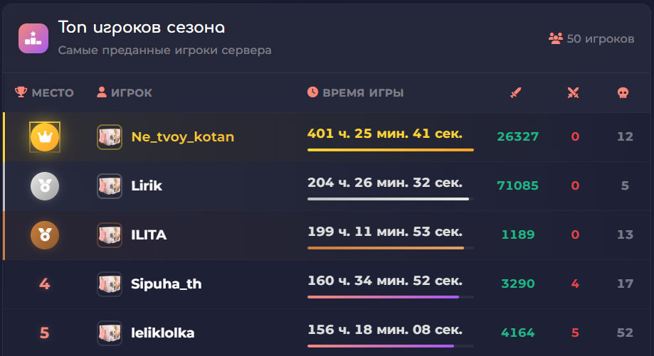 - топ 1 по времени игры занял игрок Ne_tvoy_kotan отыграв на сервере 401 час!