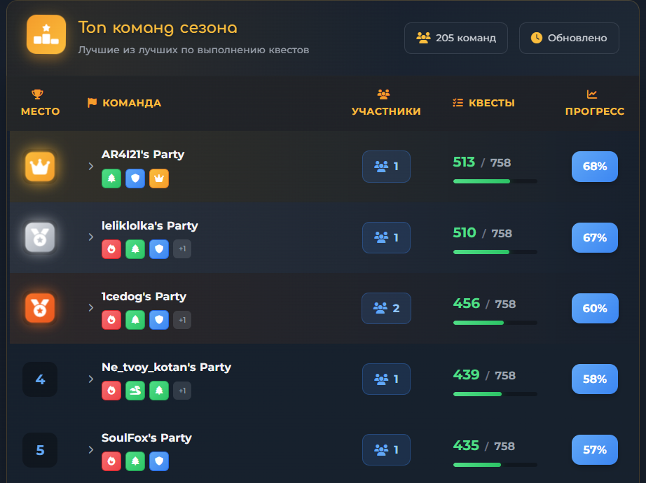 - топ 1 по квестовому прогрессу заняла команда AR4I21's Party с единственным участником AR4I21 - удалось набрать рекордные 68% прогресса в этом сезоне.