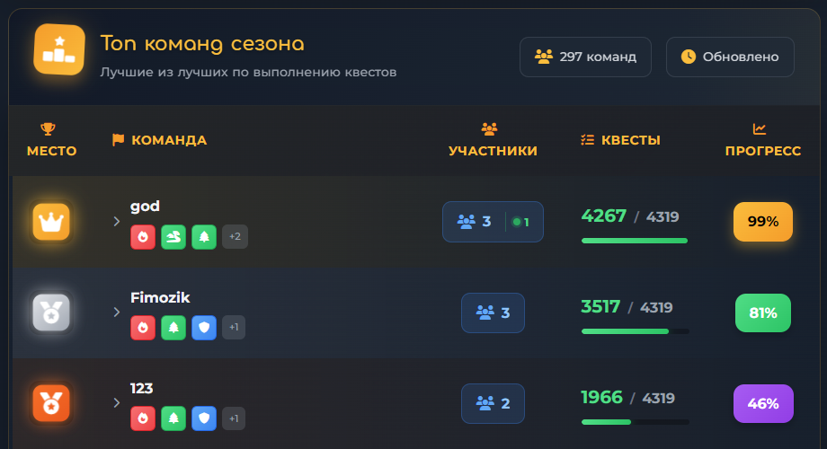 - топ 1 по квестовому прогрессу заняла команда god с 3 участниками Dmitrii, toshachuvak и Zvator - им удалось набрать рекордные 99% прогресса с общим временем игры 261 час на всю команду!