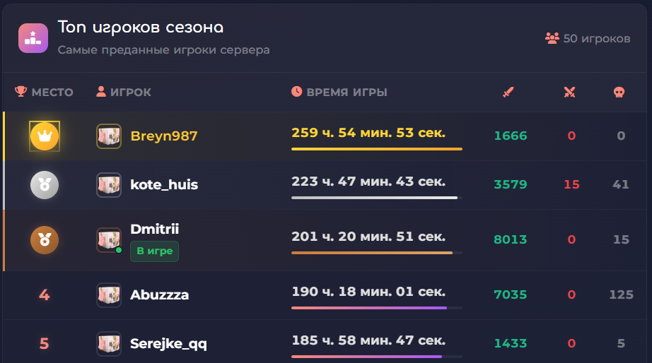 - топ 1 по времени игры занял игрок Breyn987 отыграв на сервере 260 часов!